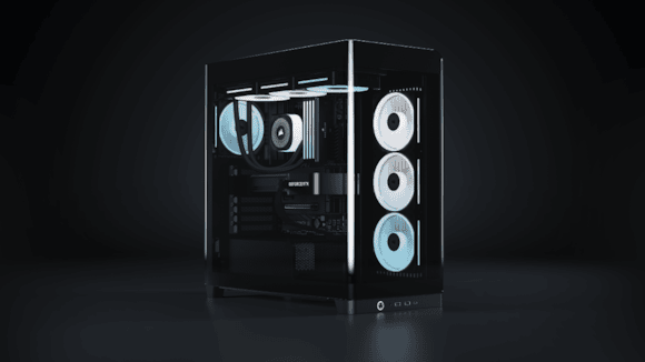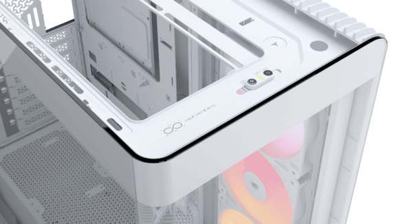 De behuizing valt direct op door de one-piece panoramische glasplaat die van voor naar zijkant doorloopt. Dankzij het handige montagesysteem klik je het glas eenvoudig los voor toegang tot de ruime binnenkant. Hier vind je onder andere het InfiniRail Fan Mounting System, een verstelbare rail waarmee je 120mm of 140mm fans kunt plaatsen waar jij wilt. Zowel de boven- als zijkanten zijn geventileerd met een opvallend “waterfall”-patroon voor optimale airflow.