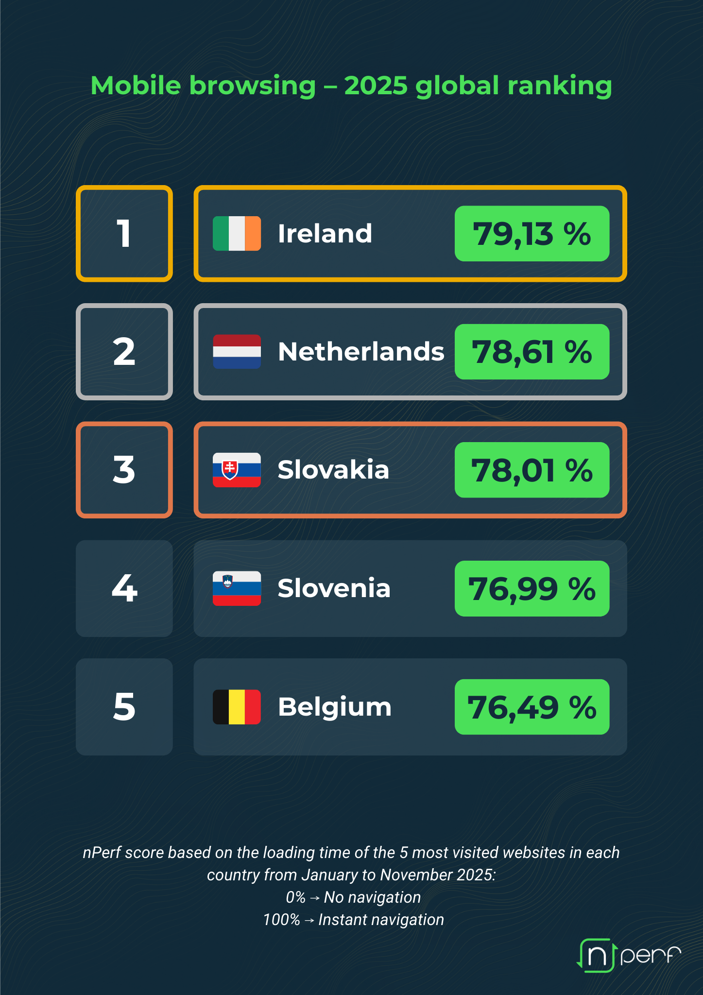 Ierland staat op de eerste plaats met een score van 79,13%, gevolgd door Nederland met 78,61% en Slowakije met 78,01%. Slovenië noteert 76,99% en België 76,49%. Een score van 100% komt overeen met een onmiddellijke laadtijd van een webpagina, terwijl 0% betekent dat de pagina niet kon worden geladen.