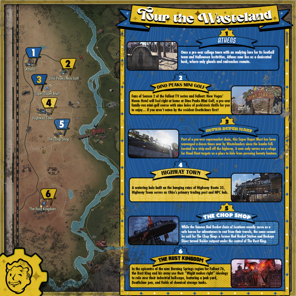 Van het ogenschijnlijk onschuldige Dino Peaks Mini Golf, dat perfect past bij Fallout’s bizarre retrofuturisme, tot de brute raiderarena van Rust Kingdom, waar geweld en spektakel hand in hand gaan – dit zijn locaties die voelen alsof ze rechtstreeks uit de serie zijn gestapt.
