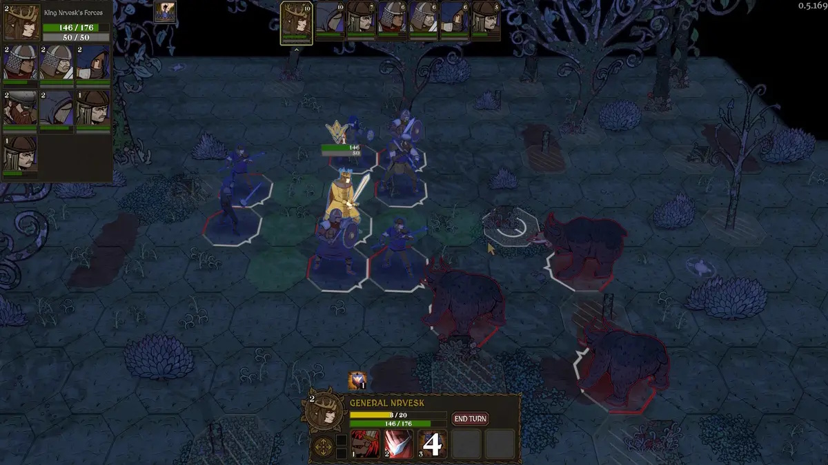 De spanning wordt versterkt doordat Nrvesk onmisbaar is: zijn dood betekent het einde van de run. Spelers moeten zorgvuldig afwegen hoe ze hem opbouwen: als inspirerende leider die zijn troepen ondersteunt, of als onstuitbare krijger die dankzij eigen kracht overleeft. Gevechten vinden plaats in een 8-richtingen-combatsysteem, waar positionering, flanken en het vasthouden van de linie het verschil maken tussen overwinning en nederlaag.