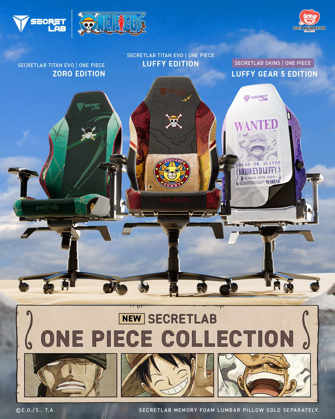 Daarnaast brengt de collectie de Secretlab Skins One Piece Gear 5 Luffy Edition, een opvallend eerbetoon aan Luffy’s ultieme vorm met felle kleuren, zijn wanted-poster en natuurlijk de Gum-Gum Fruit. Voor extra comfort is er ook een Memory Foam Lumbar Pillow in Thousand Sunny Edition, waarop het bekende schip straalt tegen een wereldkaart.