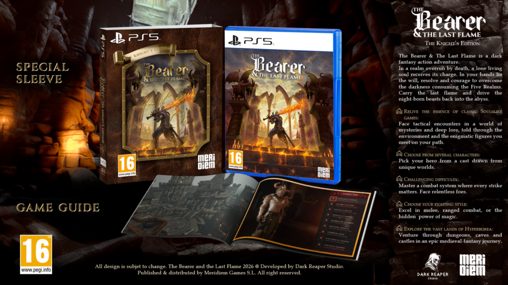 Meridiem was verantwoordelijk voor het ontwerp en de productie van deze fysieke edities: The Bearer & The Last Flame – Standard Edition voor PlayStation 5, die de PS5-game bevat, en The Bearer & The Last Flame – The Knight’s Edition, die naast de PS5-game ook een gamegids en een speciale sleeve bevat.