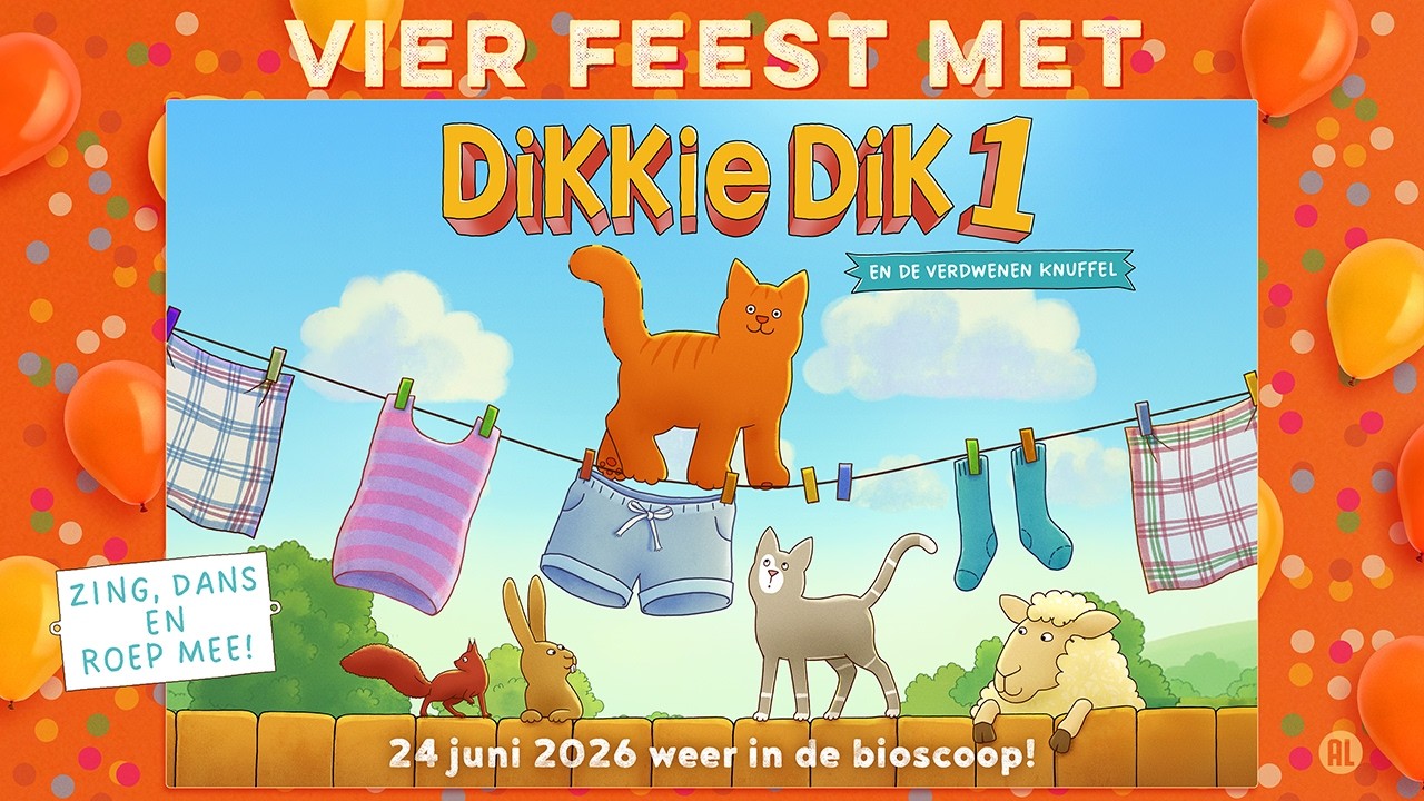 Op 24 juni maakt Dikkie Dik zijn feestelijke comeback op het grote doek en dat gaan we vieren. De met de Gouden Film bekroonde bioscoopfilm Dikkie Dik en de verdwenen knuffel (met de voice-over van Burny Bos) is de eerste film in de succesvolle doe-, roep- en dans mee-bioscoopreeks van vier Dikke Dik-films, waarin de allerjongsten actief mee kunnen doen aan het verhaal. Het wordt misschien wel hun allereerste onvergetelijke bioscoopervaring. Samen met papa en mama, of opa en oma, naar de film, hoe magisch is dat? Stilzitten hoeft helemaal niet, maar kletsen mag en meezingen en -dansen al helemaal.